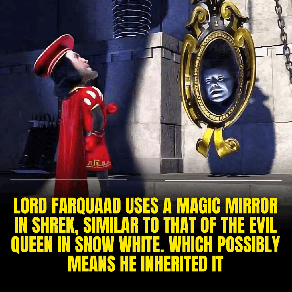 Yes. The mirror. Snow White’s whole plotline kicks off with a sassy talking mirror who says things like, “You’re pretty, but not the prettiest, babe.” Fast forward to Shrek, and who’s also chatting to a talking mirror? Lord Farquaad. Except now the mirror has become his royal dating app, presenting princesses like he’s on medieval Tinder. Coincidence? Hardly. That mirror might’ve been inherited. Or stolen. Or magically gifted at a bizarre custody hearing no one talks about. Either way, it’s not just your average mirror but more of a link between stories. A relic that ties Farquaad back to the same enchanted tech used by the Evil Queen… who might’ve been his maternal grandmother.