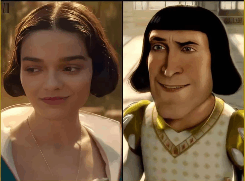 Now, let’s talk hair. Study that immaculate, chin-grazing bob framing Farquaad’s permanently smug face and tell me it doesn’t shout “Snow White’s signature style”. It’s the very same glossy, midnight-black helmet, centre-parted with surgical precision and tucked just so beneath the jawline—no stray strand, no rebellious curl. It looks as though he rummaged through his alleged mother’s dressing table, pinched her favourite comb, and declared, “I’ll take the exact cut, please—just add villainy.” Hairstyle twins might be the most overlooked paternity test in the whole enchanted kingdom.